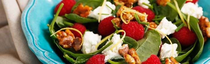 Raspberry, spinach and Persian feta salad with salted candied walnuts